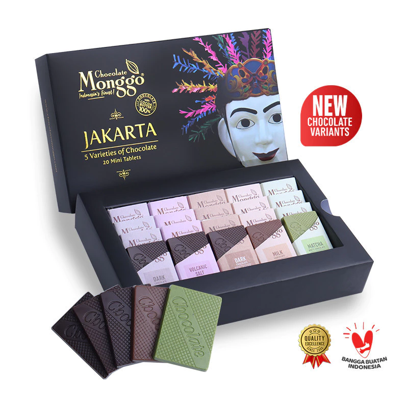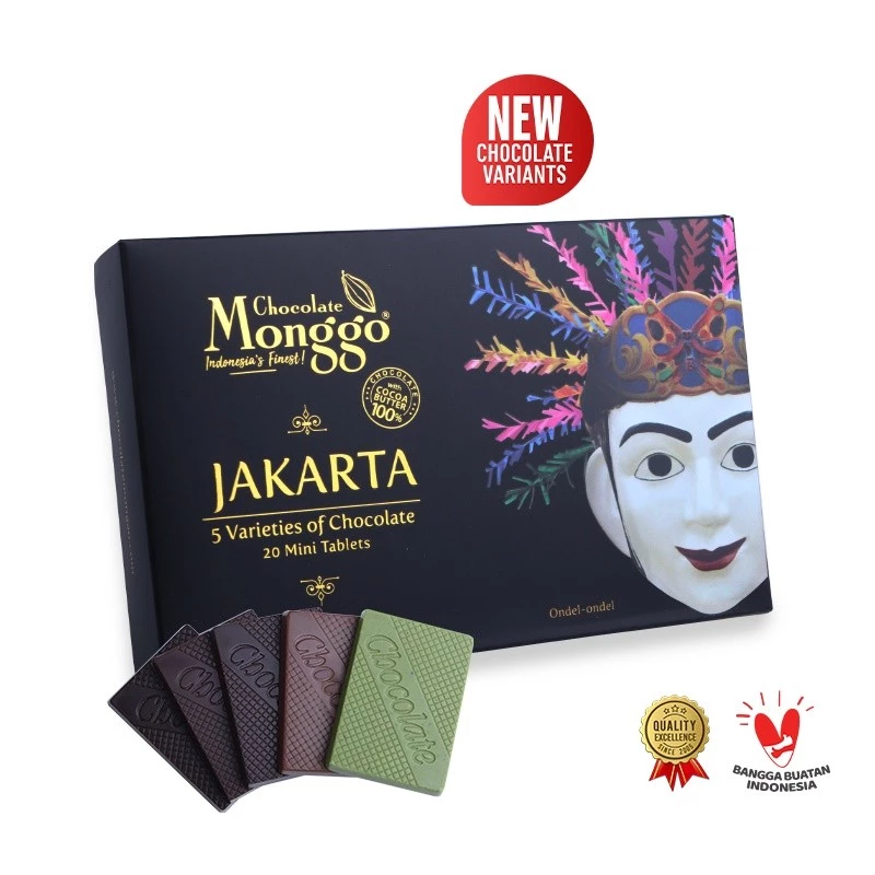 Cokelat cinderamata eksklusif dari Jakarta, variasi rasa coklat berkualitas dari Monggo. Ilustrasi Ondel Ondel pada kemasannya mencerminkan kebudayaan masyarakat Betawi yang kaya akan nilai tradisi, sehingga kotak ini sangat cocok Anda berikan kepada kerabat sebagai oleh-oleh khas Jakarta.